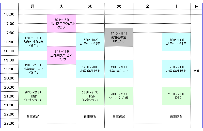 (例)低学年の時間に高学年・低学年の時間に幼年・高学年の時間に中学生・一般部に少年部等。ただし、2クラス連続で参加することは出来ませんので、どちらか一つを選んでください。